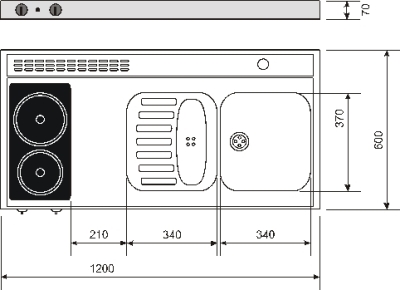 In der Herd-Spültischkombination befinden sich ein eingezogenes Becken (340 x 370 x 150mm), Hahnlochbohrung